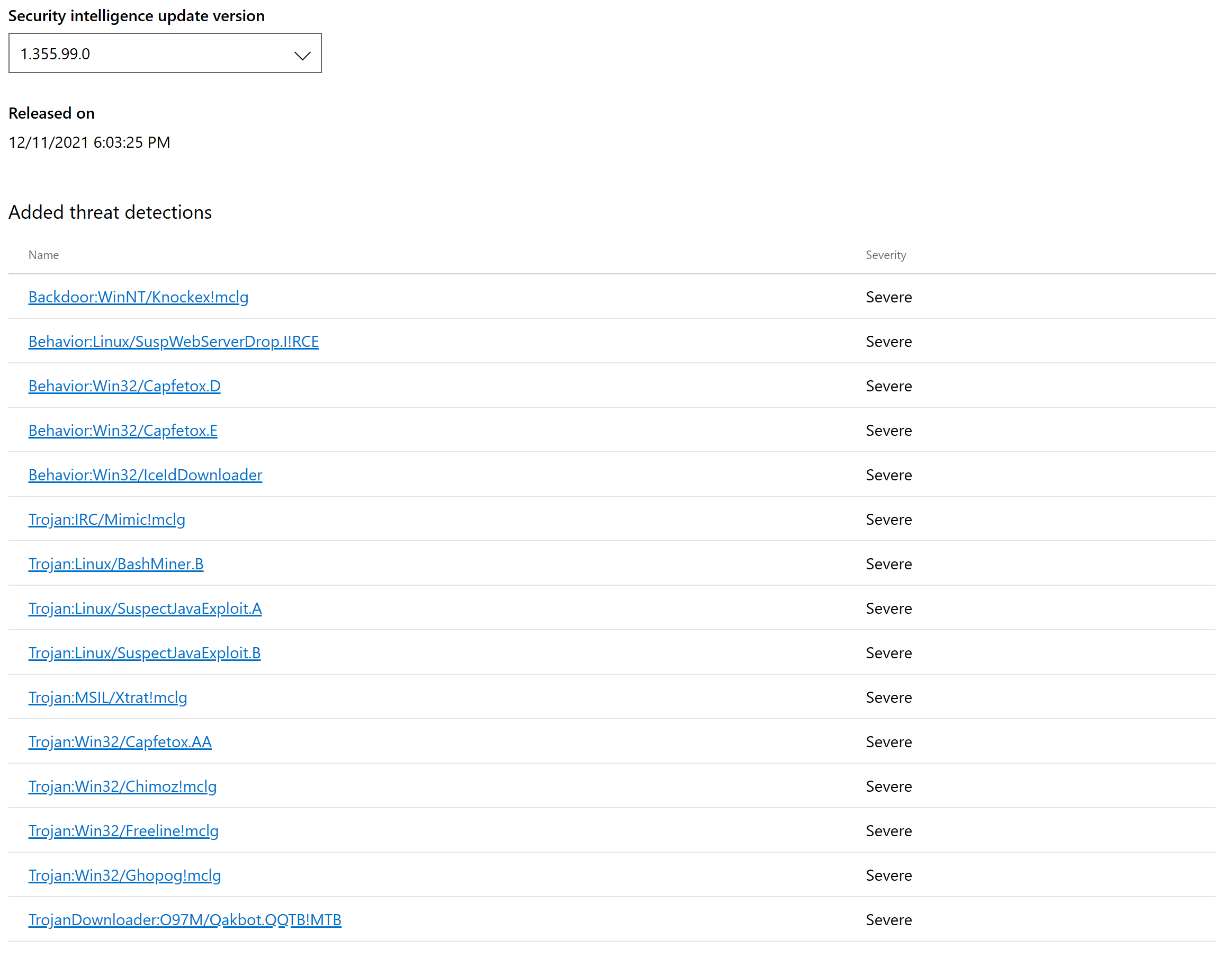 - On OS and IaaS VM security side, We release security intelligence update version 1.355.99.0 on yesterday evening for Log4j2 related exploit and malicious activities, all built-in Microsoft Defender Anti-virus in Windows (and Server) OS, Microsoft Defender for Endpoint (For Windows and Linux OS), and Defender for Servers (For Windows and Linux OS) in Microsoft Defender for Cloud which integrated with MDE, will get this update if automatic update is enabled, and block Log4j2 vulnerability on OS level. After that release, we also continue to investigate related attack and release more security intelligence update – latest version is 1.355.128.0 when I writing this email.