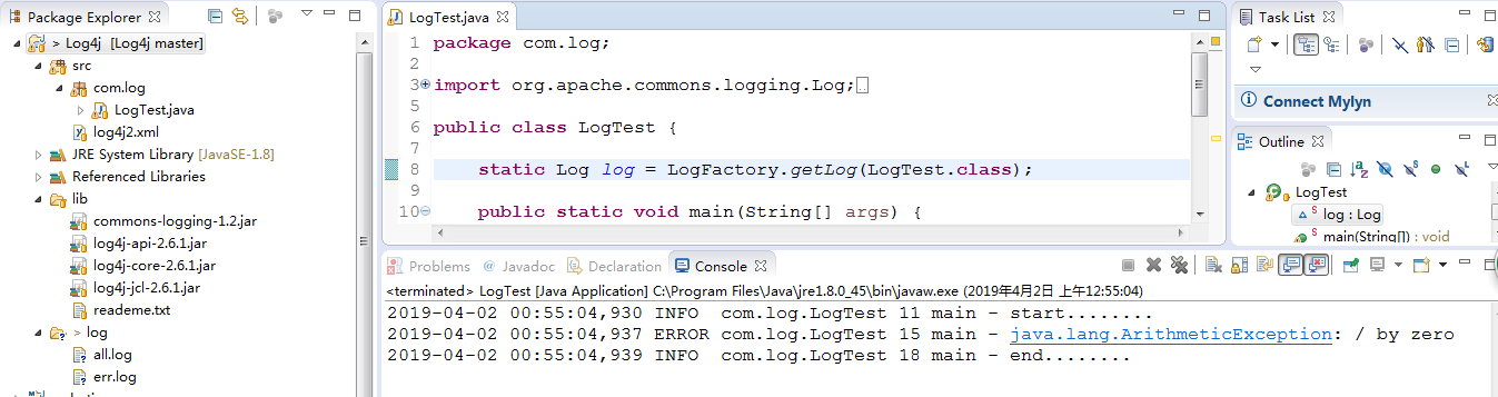 2019-04-02 00:55:04,937 ERROR com.log.LogTest 15 main - java.lang.ArithmeticException: / by zero