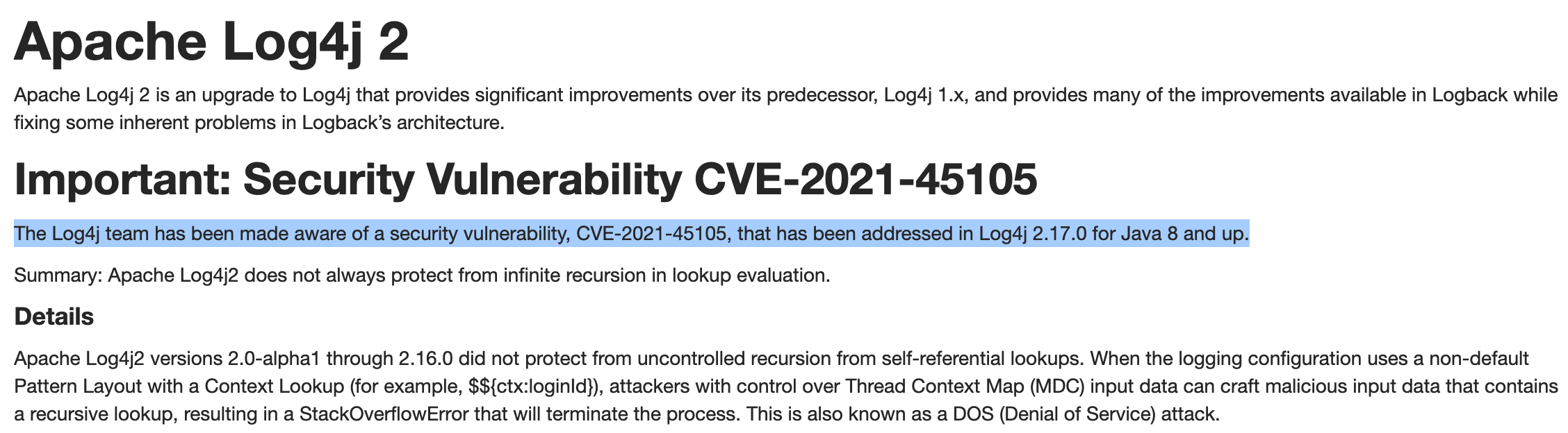 Log4j 团队又获悉了一个重要的安全漏洞 CVE-2021-45105: