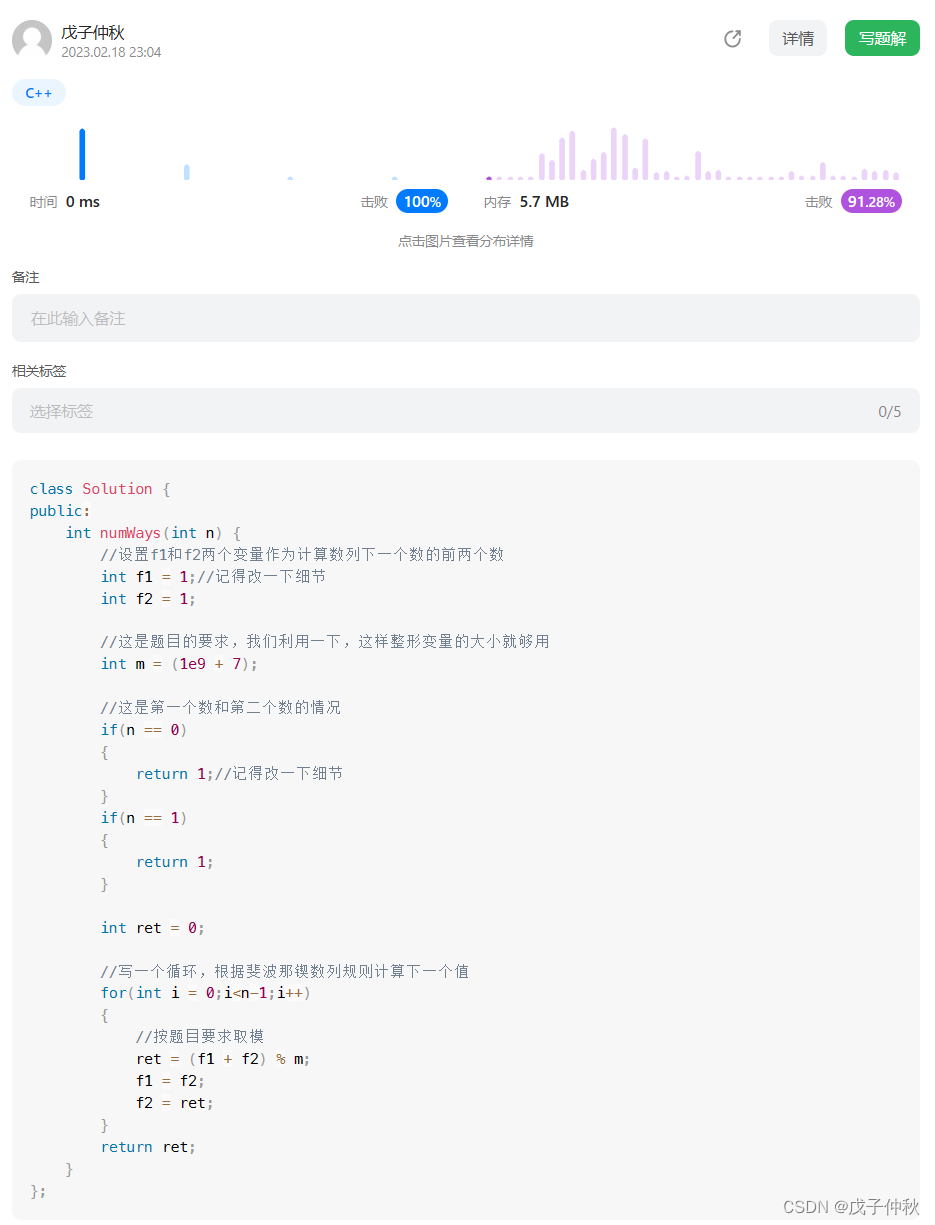 以上就是秀丽机器猫最近收集整理的关于【LeetCode】剑指 Offer(4)写在前面:题目:剑指 Offer 10- I. 斐波那契数列 - 力扣(Leetcode)题目:剑指 Offer 10- II. 青蛙跳台阶问题 - 力扣(Leetcode) 小总结:写在最后:的全部内容,更多相关【LeetCode】剑指内容请搜索靠谱客的其他文章。