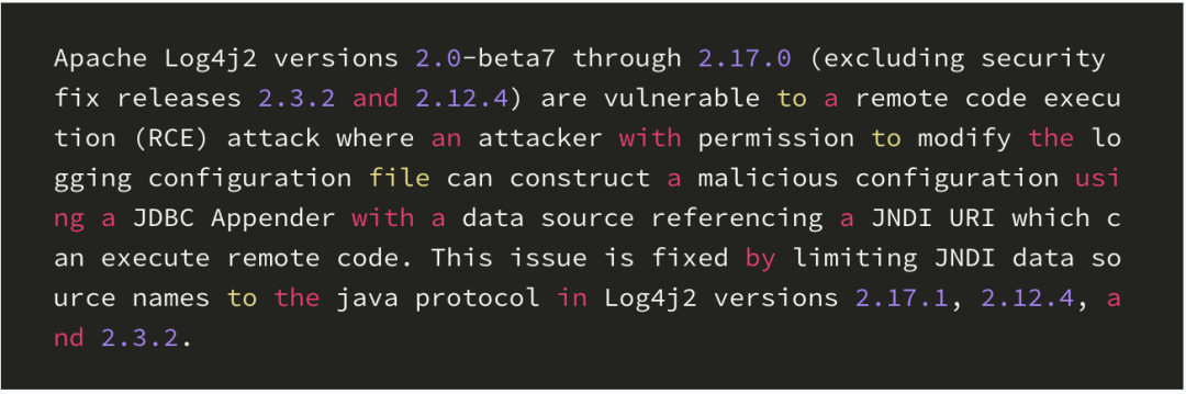 也就是说,到2.17.0的log4j2在面对RCE(即远程代码执行)攻击时都是脆弱的。但是只有当攻击者有权限修改logging的配置文件,然后将其修改为一个恶意的配置文件,并且用了带JNDI数据源的JDBC Appender来执行远程代码,才会对服务器有影响。