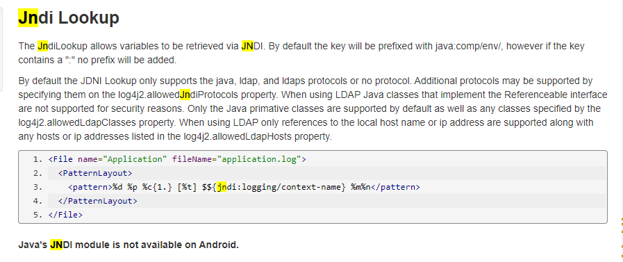 log4j2 官方文档也同样支持 Jndi Lookup