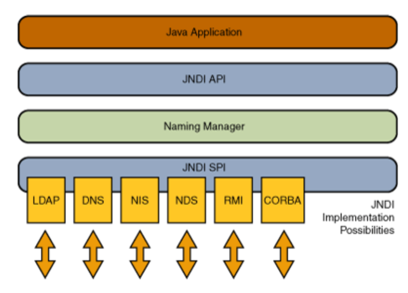 JNDI支持多种命名和目录提供程序(Naming and Directory Providers),RMI注册表服务提供程序(RMI Registry Service Provider)允许通过JNDI应用接口对RMI中注册的远程对象进行访问操作。将RMI服务绑定到JNDI的一个好处是更加透明、统一和松散耦合,RMI客户端直接通过URL来定位一个远程对象,而且该RMI服务可以和包含人员,组织和网络资源等信息的企业目录链接在一起。