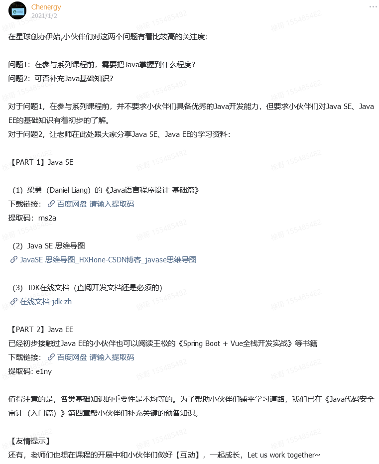 为更顺利的完成课程相关内容,请同学一定要提前预习相关知识点,已经报名的同学,请阅读报名时赠送的《JAVA代码审计:入门篇》一书,并且在赠送的“JAVA审计星球”中学习相关的内容。