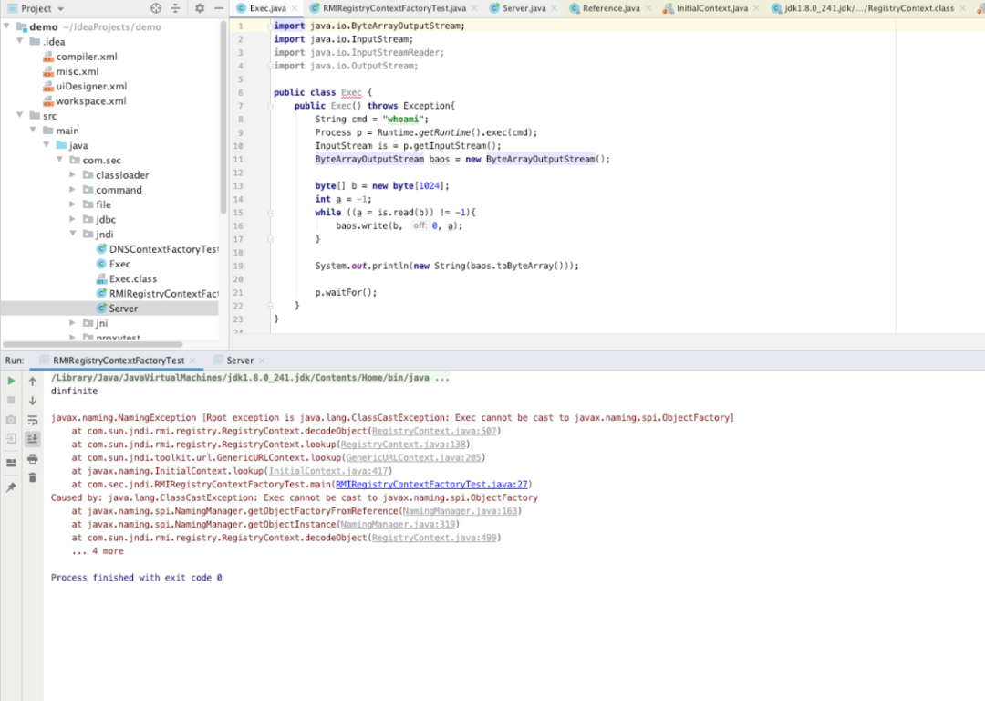 上述代码非常简单,主要是将/exec这个路径绑定到一个Reference上,而这个Reference指向127.0.0.1:8080/Exec.class,其中Reference的构造函数第一个参数是className,第二个参数是classFactory