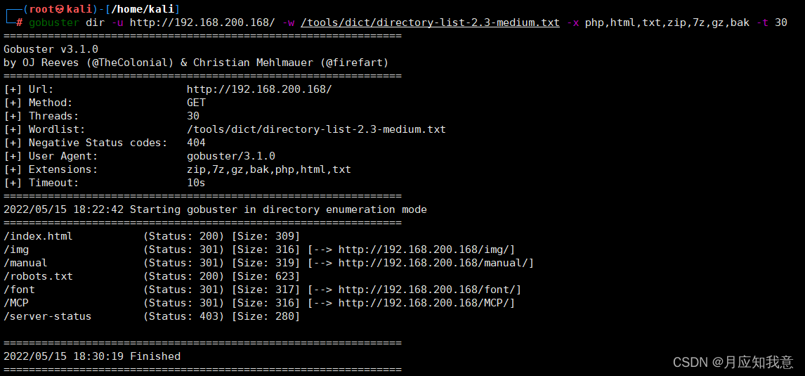 gobuster dir -u http://192.168.200.168/ -w /tools/dict/directory-list-2.3-medium.txt -x php,html,txt,zip,7z,gz,bak -t 30