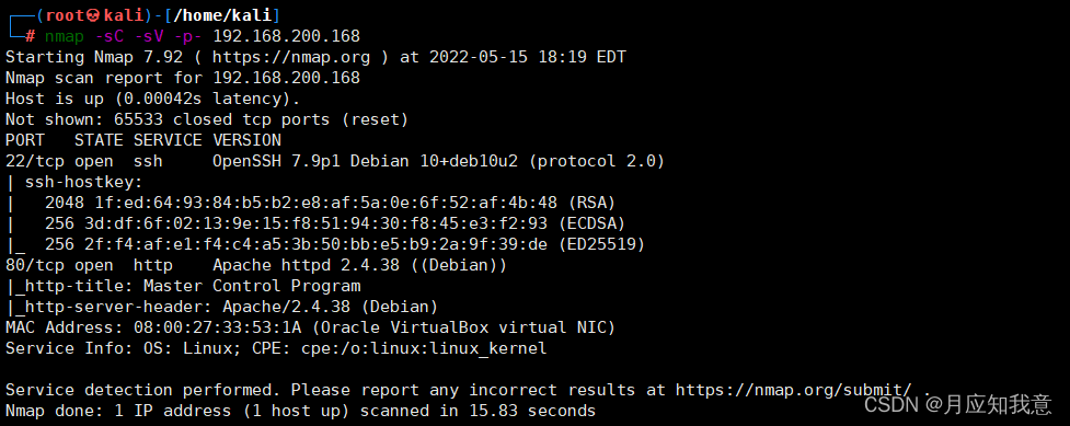 然后使用nmap扫描端口,探测开放的服务,这里发现目标主机开放了ssh服务和http服务