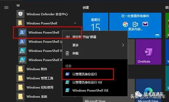 点击“开始”按钮,在“应用程序”菜单中找到“Windows PowerShell”文件夹并展开。然后,右击“Windows PowerShell”应用程序,在上下文菜单中点击“以管理员身份运行”。