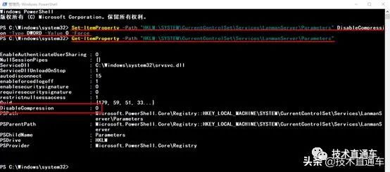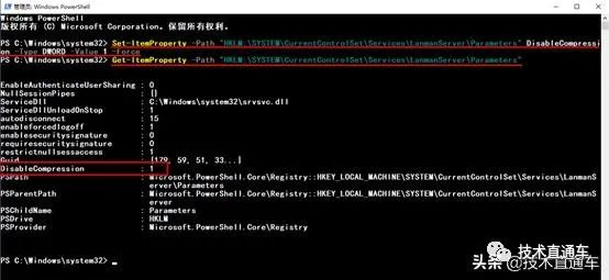Set-ItemProperty -Path "HKLM:SYSTEMCurrentControlSetServicesLanmanServerParameters" DisableCompression -Type DWORD -Value 1 -Force
