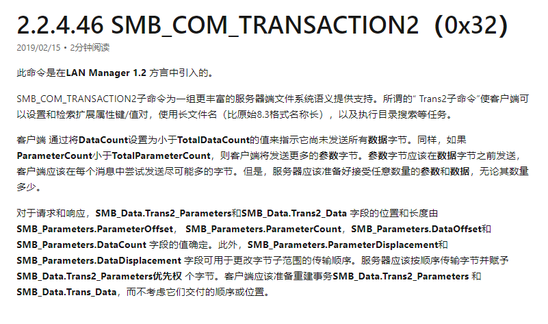 如MSDN中所述:“在Transaction2子命令和NT_TRANSACT_CREATE子命令中使用SMB_FEA数据结构来编码扩展属性(EA)名称/值对”。因此,前面看到的解析错误可以允许以大于0xFFFF的大小发送SMB_FEA_LIST,但以常规的Transaction2子命令请求是不可能实现的。下面是微软文档的介绍: