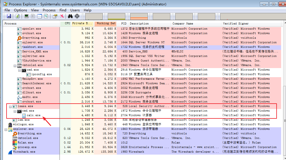 由于我们常用的是R3的应用程序,而上面的漏洞是在R0发生的,由于会话隔离,看不见对应的calc.exe弹出来,打开Process Explorer即可看见。