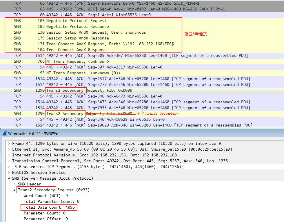 在第一个NT Trans请求之后,漏洞利用程序会发送多个Trans2 Secondary(SMB_COM_TRANSACTION2_SECONDARY)请求,并将“ TotalDataCount”字字段设置为4096。当消息有效负载很大且必须在多个SMB事务之间拆分时,使用“_SECONDARY”子命令, 下面是我测试时截的图: