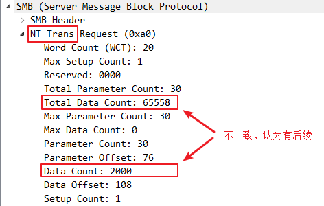 为什么可以使用错误的数据包顺序?而不是一次发送完呢?因为先发送 Trans 类型的数据包,由于大小total data count字段 的值和data count字段的值不一致,SrvSmbTransaction 函数认为这个请求包含多个数据包所以会等待后续的数据包,而不是调用ExecuteTransaction 处理这次请求。