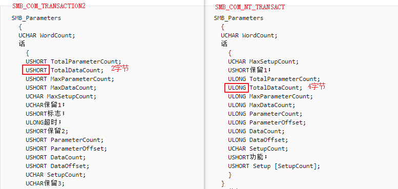 由于srv.sys按照序列的最后一个数据包中设置的SMB命令值错误地映射了接收到的多个事务数据包类型,因此存在此错误。因此,即使使用NT Trans请求启动事务,最后,整个事务也将映射为Trans2请求类型,因为这是在最后一个数据包中设置的值(上面说过了)。此外,如果比较这两种结构,我们会注意到“ TotalDataCount”值字段在NT Trans中为DWORD,在Trans2请求中为WORD。因此,此错误使得有可能在Trans2请求中发送大于65535(0xffff)限制的payload,由上图就可知,确实发送了大于65535(0xffff)限制的payload(65558->0x10016)。