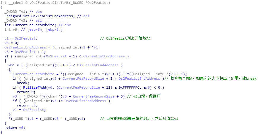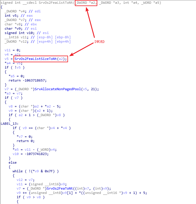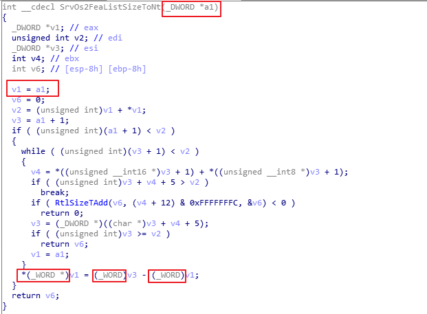 再来详细看看srv!SrvOs2FeaListSizeToNt函数,该函数会计算对应的FEA LIST的长度并随后对长度进行更新,该长度一开始为DWORD类型的,之后的长度更新代码中计算出的size拷贝回去的时候是按WORD进行的拷贝,此时只要原变量a中的初始值大于0xFFFF,即为0x10000+,该函数的计算结果就会增大。