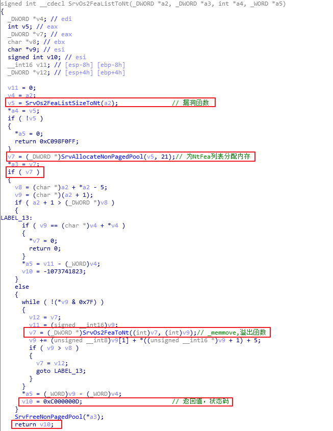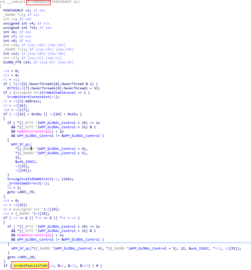 入口处理函数为SrvSmbOpen2,其中漏洞出现在函数SrvOs2FeaListToNt中,用IDA打开srv.sys进行分析: