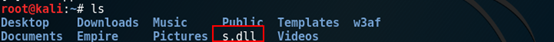 说明:-p指定攻击载荷,LHOST指定监听地址,LPORT指定监听端口,-f指定木马程序格式为dll,>指定生成木马程序的保存路径,s.dll表示木马程序保存在当前目录下,我们可以通过ls查看。