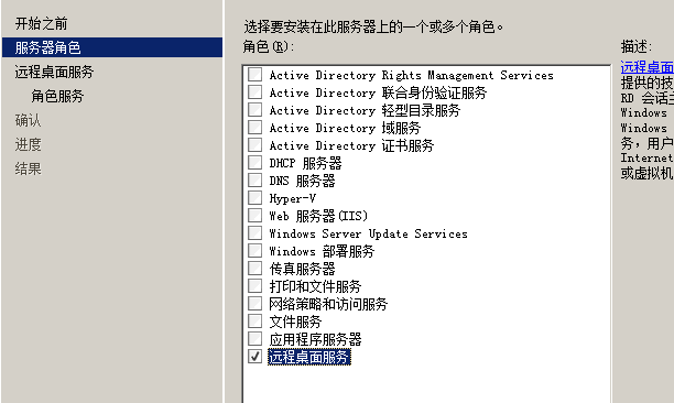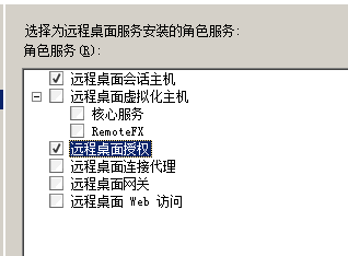 勾选“远程桌面会话主机”和“远程桌面授权”选项