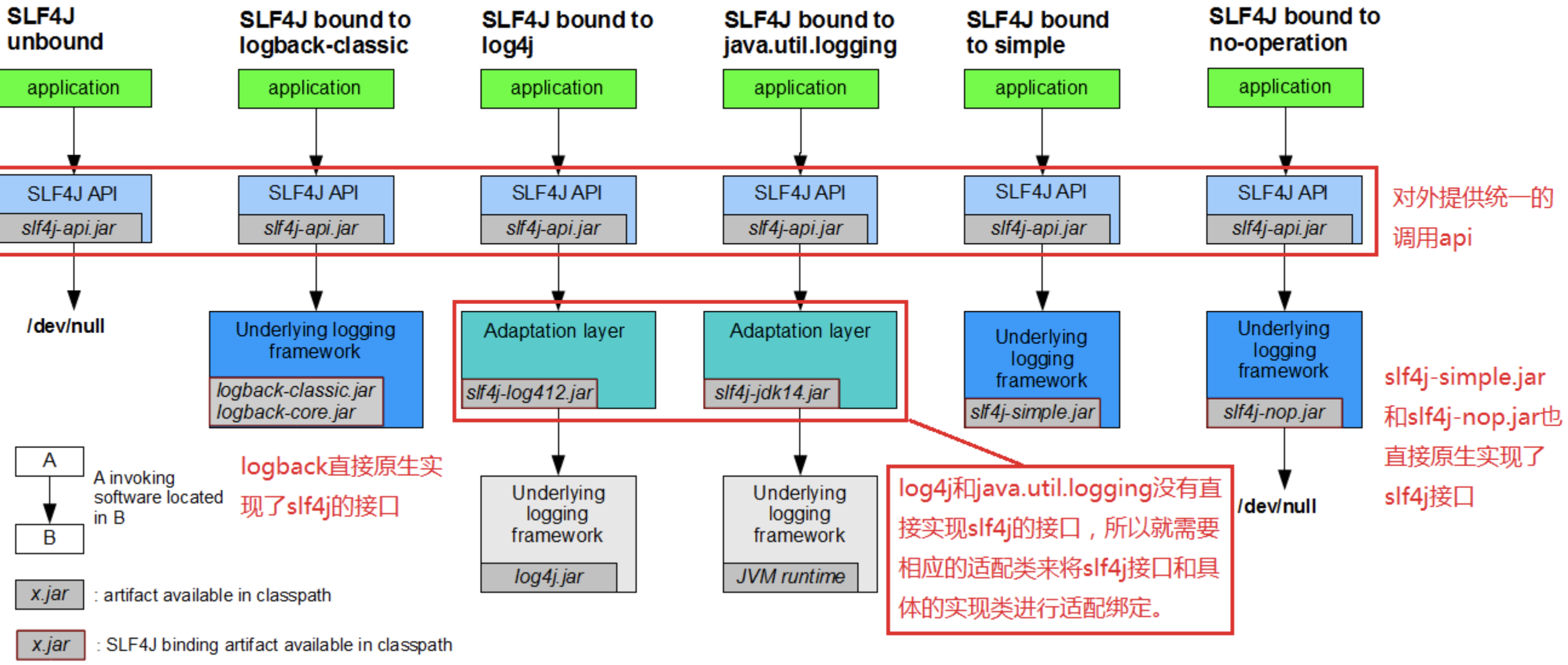 SLF4J(Simple logging Facade for Java)即Java简单日志门面(如果不了解门面模式的可以参看文末链接1),把不同的日志系统的实现进行了具体的抽象化,只提供了统一的日志使用接口。引用别人的下面那个图比较清楚,SLF4j是对外提供统一的API接口,下面绑定了具体的实现框架,如果你的pom文件中引用了多个,如logback和log4j都引用了会提示警告Class path contains multiple SLF4J bindings。