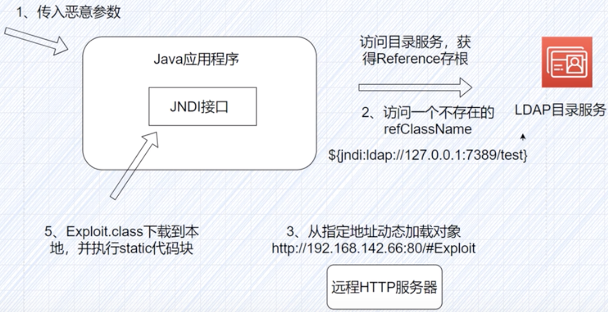 JNDI注入流程如下图所示,调用JNDI接口时传入恶意参数,访问目录服务获取Reference存根。然后访问LDAP目录服务中不存在的refClassName。从指定地址动态加载Exploit对象,Exploit对象的静态代码块可以执行打开计算器操作。RMI(Remote Method Invocation,远程方法调用)也可以通过这种方式实现攻击。