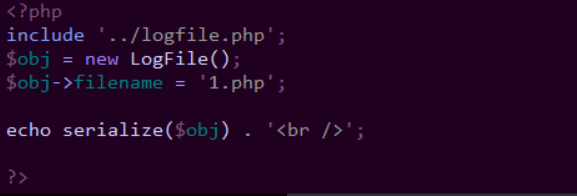 访问得到序列化代码:得到序列化之后的字符串O:7:"LogFile":1:{s:8:"filename";s:5:"1.php";}