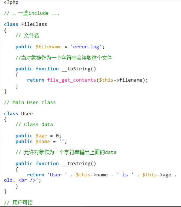 打个比方,某用户类定义了一个__toString为了让应用程序能够将类作为一个字符串输出(echo $obj) ,而且其他类也可能定义了一个类允许__toString读取某个文件。