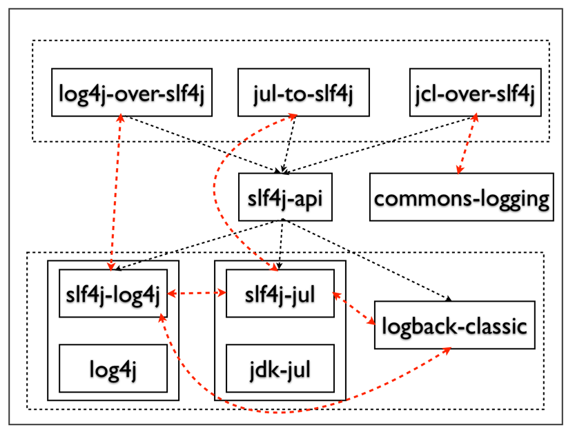 当然slf4j也提供了可以把对slf4j的调用桥接到JCL上的工程包——slf4j-jcl,可以看出slf4j的设计者考虑非常周到,想想这样的情况:遗留系统使用的是JCL+log4j,因为系统功能演进,依赖了其他业务线的库,恰好那个库依赖了slf4j-api,并且应用需要关心这个库的日志,那么就需要转接日志到JCL上即可。细心的你可能一经发现,slf4j-jcl和jcl-over-slf4j也是互斥的,太多互斥的了:(。