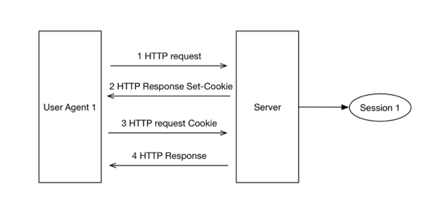 HTTP State Management Mechanism(HTTP状态管理机制)中定义了HTTP Cookie和Set-Cookie头字段。利用Set-Cookie头字段,HTTP服务器可以向用户代理传输名值对(name/value pair)和关联的元数据(称为cookie)。当用户代理向服务器发送接下来的请求时,用户代理根据元素数据和其他信息来决定是否在Cookie头中返回名值对。一个回话建立过程如图1所示: