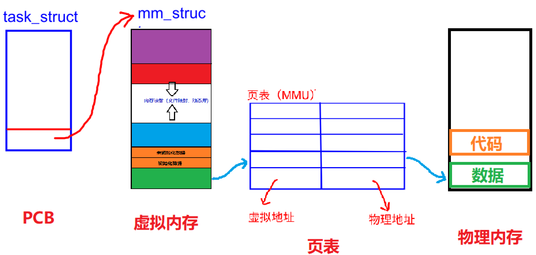 因此,进程 = 进程控制块(task_struct) + 虚拟内存(mm_struct) + 页表(MMU) + 物理内存中的代码和数据