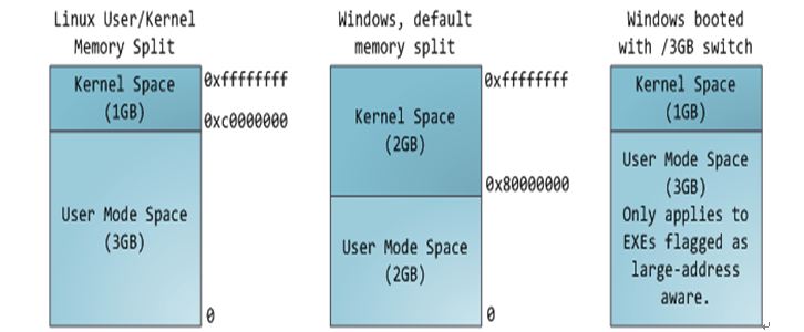 多任务操作系统中的每一个进程都运行在一个属于它自己的内存沙盘中,这个沙盘就是虚拟地址空间(virtual address space),在32位模式下,它总是一个4GB的内存地址块。这些虚拟地址通过页表(page table)映射到物理内存,页表由操作系统维护并被处理器引用。每个进程都拥有一套属于它自己的页表,但是还有一个隐情,只要虚拟地址被使能,那么它将会作用于这台机器上运行的所有软件,包括内核本身,因此,有一部分虚拟地址必须保留给内核使用。进程内存空间分布如下图所示: