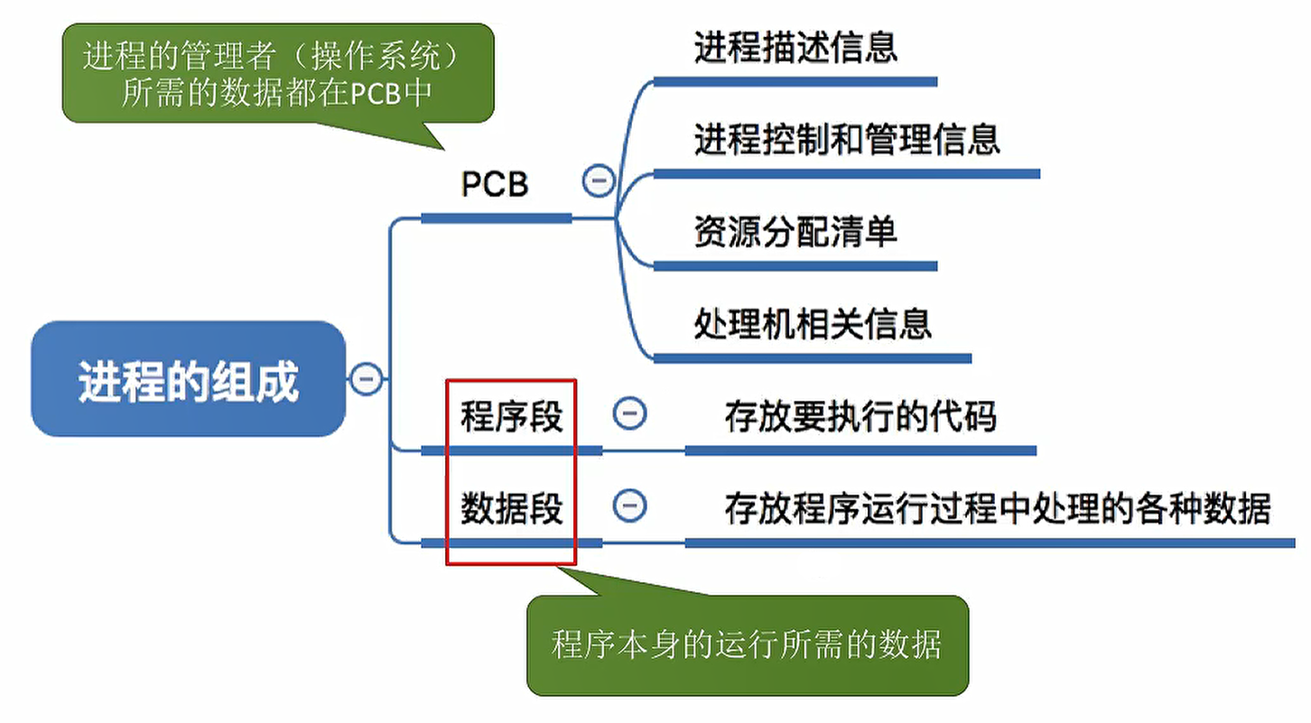严格来说,进程实体和进程并不一样,进程实体是静态的,进程则是动态的。不过,除非题目专门考察二者区别,否则可以认为进程实体就是进程。因此我们也可以说“进程由程序段、数据段、PCB三部分组成”