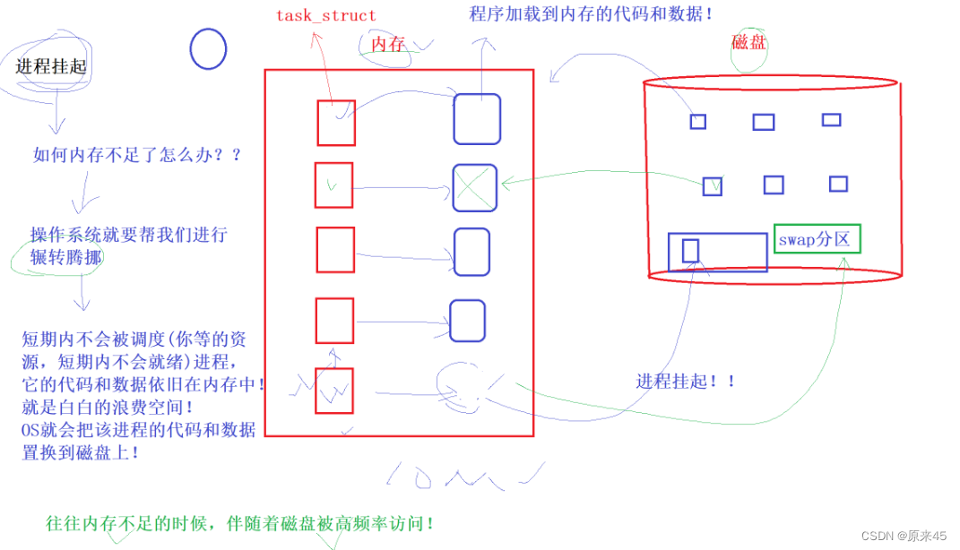 因短期不会被调度,所有只留PCB,代码和数据放回到磁盘(swap分区,操作系统管理的,临时做数据存储的),以此达到增加内存空间的目的。
