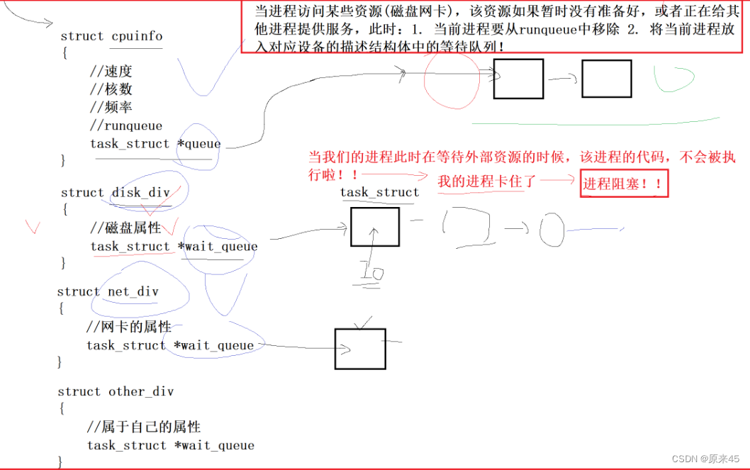进程等待某种资源(非CPU),资源没有就绪的时候,进程需要在该资源的等待队列中进行排队,此时进程的代码没有运行,进程所处的状态叫做阻塞。